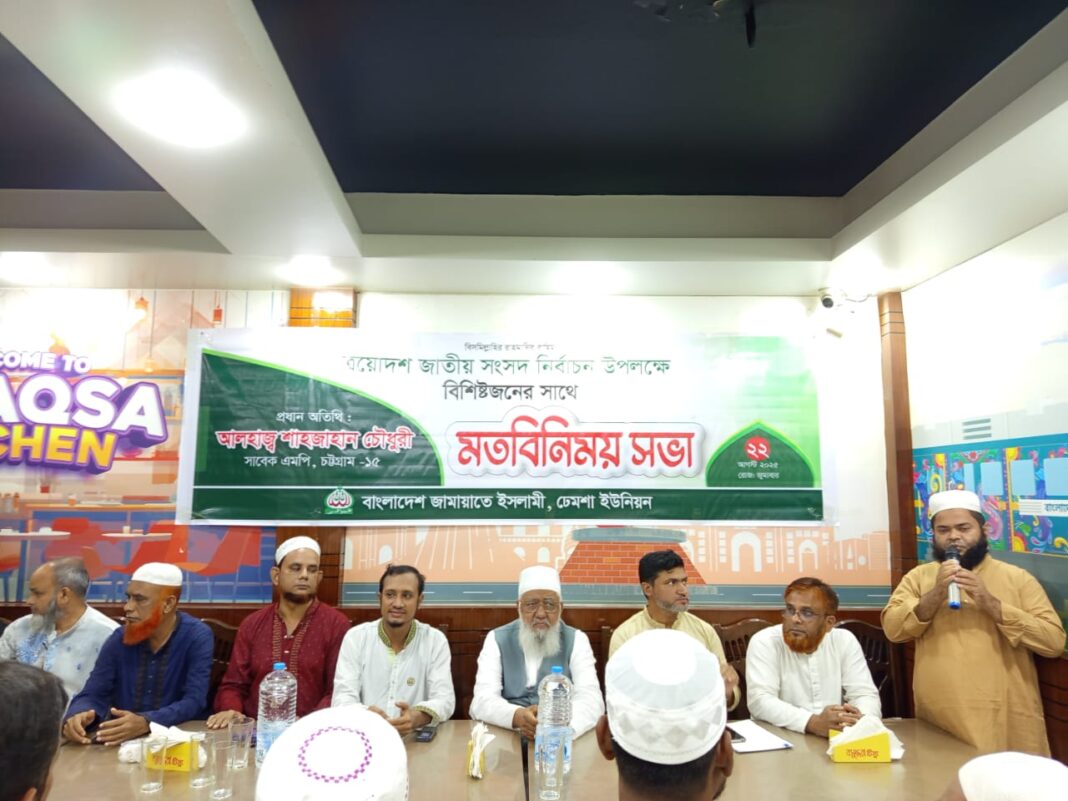 ২২আগস্ট জুমাবার দিবাগত রাতে কেরানিহাটের আল আকসা রেস্টুরেন্টের কনফারেন্স রুমে বাংলাদেশ জামায়াতে ইসলামী সাতকানিয়া উপজেলার ঢেমশা ইউনিয়নের উদ্যোগে আয়োজিত ত্রয়োদশ জাতীয় সংসদ নির্বাচন উপলক্ষ্যে বিশিষ্টজনদের সাথে মতবিনিময় সভায় প্রধান অতিথির বক্তব্যে তিনি এসব কথা বলেন।