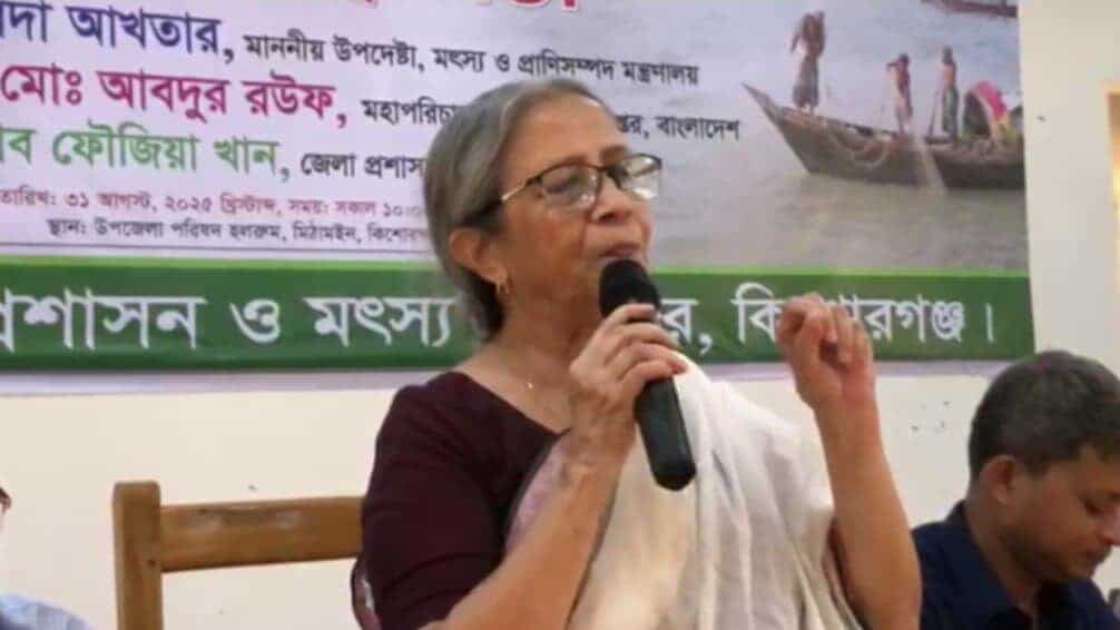 রোববার (৩১ আগস্ট) দুপুরে কিশোরগঞ্জের মিঠামইনে ইটনা, মিঠামইন ও অষ্টগ্রাম উপজেলার নিবন্ধিত মৎস্যজীবীদের সঙ্গে মতবিনিময় সভায় বক্তব্য দিচ্ছেন মৎস্য ও প্রাণিসম্পদ উপদেষ্টা ফরিদা আখতার।