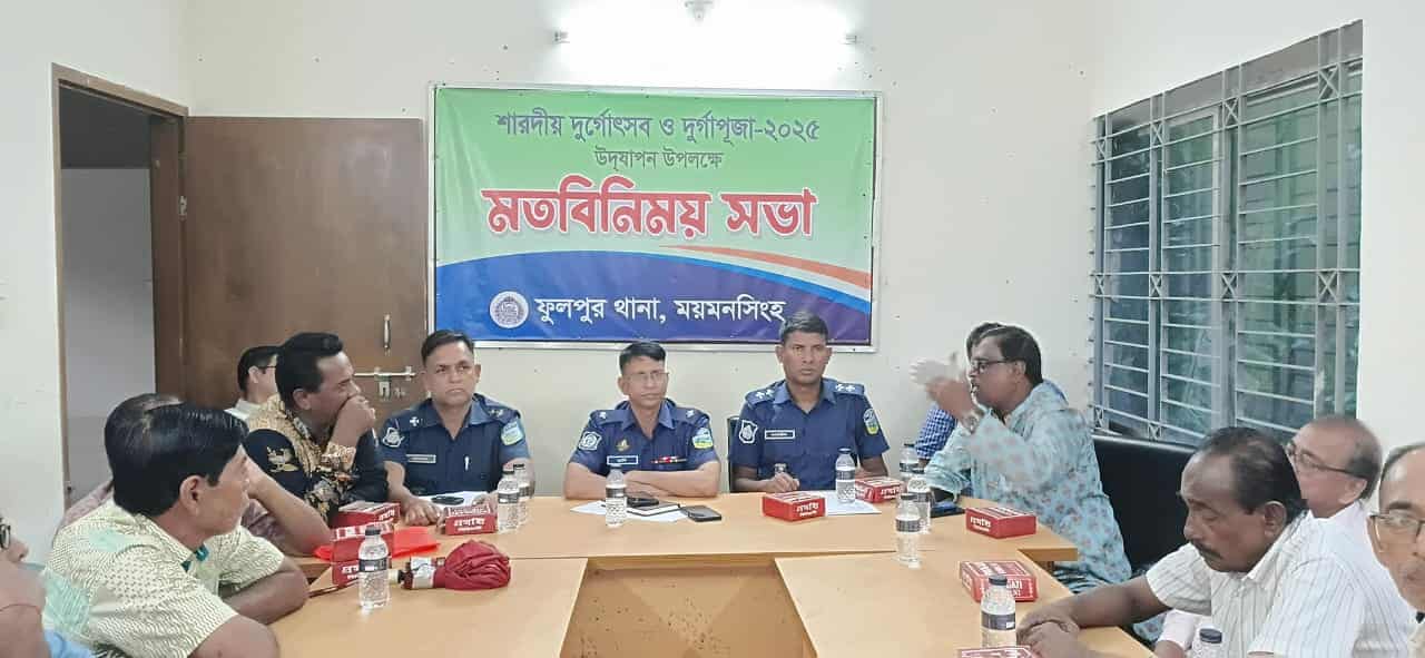 ময়মনসিংহের ফুলপুর থানা এলাকার এবার ৪৬ টি মণ্ডপে  শারদীয় দুর্গাপূজা অনুষ্ঠিত হতে যাচ্ছে। এবিষয়ে  আইন-শৃঙ্খলা রক্ষা সংক্রান্তে ও শান্তিপূর্ণভাবে পূজা সম্পূর্ণ করার লক্ষ্যে আজ মঙ্গলবার বিকালে ফুলপুর থানার ভারপ্রাপ্ত কর্মকর্তা (ওসি) মোঃ আব্দুল হাদির সভাপতিত্বে সকল পূজা মন্ডপের পূজা কমিটির সভাপতি ও সাধারণ সম্পাদকদের নিয়ে মতবিনিময় সভা অনুষ্ঠিত হয়েছে।