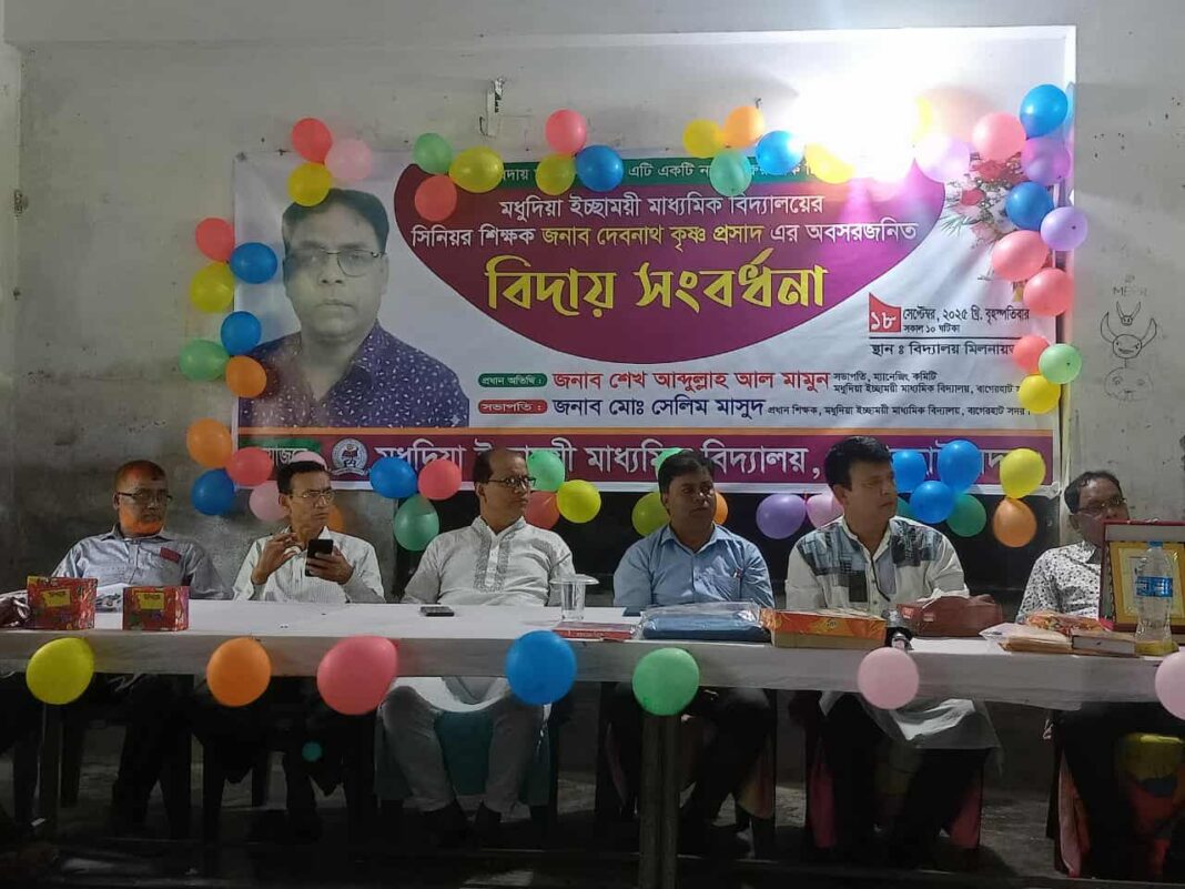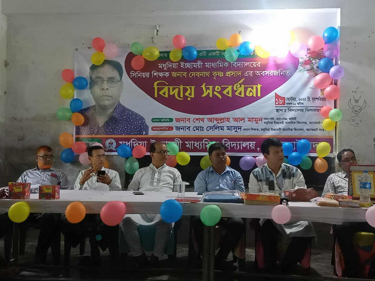 বাগেরহাট সদর উপজেলার ঐতিহ্যবাহী মধুদিয়া ইচ্ছাময়ী মাধ্যমিক বিদ্যালয়ের সিনিয়র শিক্ষক দেবনাথ কৃষ্ণ প্রসাদ এর অবসরজনিত বিদায় সংবর্ধনা অনুষ্ঠিত হয়েছে। বৃহস্পতিবার (১৮ সেপ্টেম্বর) সকালে বিদ্যালয়ের অডিটোরিয়ামে বর্ণাঢ্য আয়োজনের মধ্য দিয়ে দেবনাথ কৃষ্ণ প্রসাদ কে বিদ্যালয়ের শিক্ষক-শিক্ষার্থীদের পক্ষ থেকে সম্মাননা স্মারক, মানপত্র ও উপহার সামগ্রী প্রদান করা হয়।