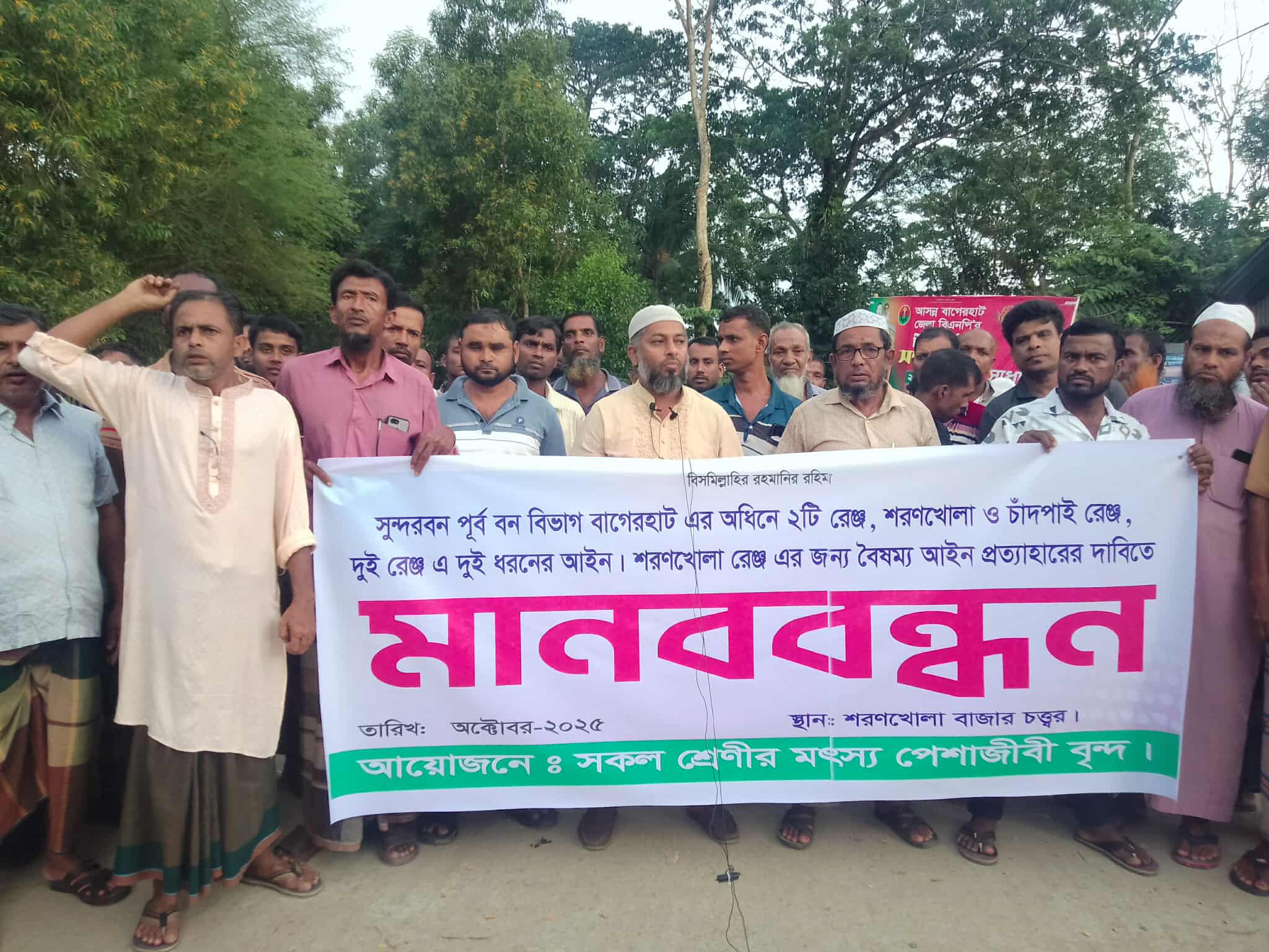 বাগেরহাটের শরণখোলায় পূর্ব সুন্দরবনের শরণখোলা রেঞ্জের ৮৪ ভাগ এলাকা অভয়ারণ্য ও অভয়াশ্রম থাকলেও সাতক্ষীরা ও চাঁদপাই রেঞ্জে মাত্র ৩০ থেকে ৪০ ভাগ অভয়াশ্রম এ বৈষম্য দূরীকরণের দাবিতে দাবিতে মানববন্ধন করেছে সুন্দরবনের উপর নির্ভরশীল সকল মৎস্য ও পেশাজীবিবৃন্দ।