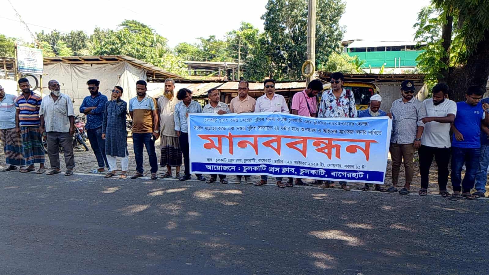 সোমবার (২০ অক্টোবর) সকাল ১১ টার সময় চুলকাটি প্রেসক্লাবের সভাপতি সেকেন্দার মোড়ল এর সভাপতিত্বে ও কোষাধক্ষ্য অমিতকর বিলাস এর সঞ্চালায় মানববন্ধনে বক্তব্য রাখেন প্রেসক্লাব রামপাল এর সাধারণ সম্পাদক ও এশিয়ান টিভির রামপাল-মোংলা প্রতিনিধি সুজন মজুনদার, সহ-সভাপতি আকবর কবির পিন্টু, যমুরা টিভির রামপাল-মোংলা প্রতিনিধি মনোয়ার রনি, সাংগঠনিক সম্পাদক ও দৈনিক খুলনা গেজেট রামপাল প্রতিনিধি মেহেদী হাসান, ইনকিলাব রামপাল প্রতিনিধি আমিনুল ইসলাম নান্টু, দৈনিক জন্মভূমি রামপাল প্রতিনিধি রবিউল ইসলাম রাকিব, হারুন শেখ, চুলকাটি প্রেসক্লাবের সাবেক সভাপতি জিএম মিজানুর রহমান, সহসভাপতি মাহফুজুর রহমান,সাংগঠনিক সম্পাদক শেখ মিরানুজ্জামান মিরন, মিজানুর রহমান মিঠু, মজনু শেখ, তরিকুল মোল্লা, আসাদুজ্জামান শেখ সোবহান, জাকারিয়া হোসেন শাওন, রিয়াদ মোড়ল, সাকিব হাসান জনি, শৈশব, মুরাদ শেখ, ইমরুল হাসান সাজ্জাদ প্রমূখ।