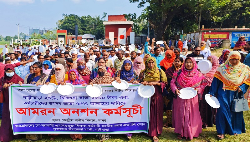 শিক্ষা মন্ত্রণালয়ের জারি করা ৫ ভাগ বাড়ি ভাড়ার প্রজ্ঞাপন প্রত্যাখ্যান করে প্রত্যাশিত দাবি আদায়ে গাইবান্ধার সুন্দরগঞ্জে ভুখা মিছিল করেছেন বেসরকারি এমপিওভূক্ত শিক্ষক-কর্মচারীরা।