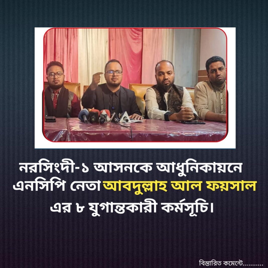নরসিংদী সদরকে একটি আধুনিক নগরী হিসাবে গড়ে তুলতে প্রযুক্তি নির্ভর করে এবং সদরে কর্মসংস্থান সৃষ্টির মাধ্যমে একটি স্বনির্ভর নরসিংদী গড়ার প্রত্যাশা ও চিকিৎসা সেবাকে জনগণের দোরগোড়ায় পৌঁছাতে জাতীয় নাগরিক পার্টি-এনসিপি এর কেন্দ্রীয় যুগ্ম মুখ্য সংগঠক ও নরসিংদী-১ আসনে সংসদ সদস্য পদপ্রার্থী আব্দুল্লাহ আল ফয়সাল এর সাংবাদিকদের সাথে মতবিনিময় সভার আয়োজন করা হয়েছে ৩ ডিসেম্বর সন্ধ্যায় শহরের একটি রেস্টুরেন্টের হলরুমে।