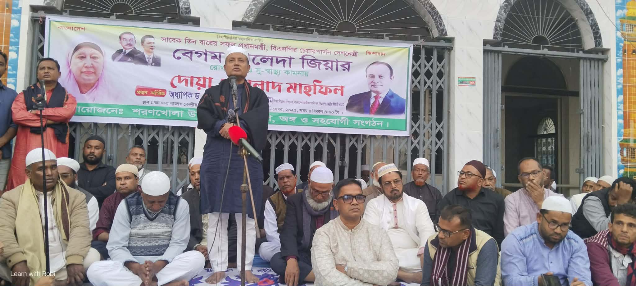 বাংলাদেশ জাতীয়তাবাদী দল বিএনপি’র চেয়ারপার্সন সাবেক প্রধানমন্ত্রী বেগম খালেদা জিয়ার রোগ মুক্তি ও সুস্থতা কামনা করে উপজেলা বিএনপির আয়োজনে মিলাদ ও দোয়া মাহফিল রায়েন্দা কেন্দ্রীয় জামে মসজিদের সামনে অনুষ্ঠিত হয়েছে।