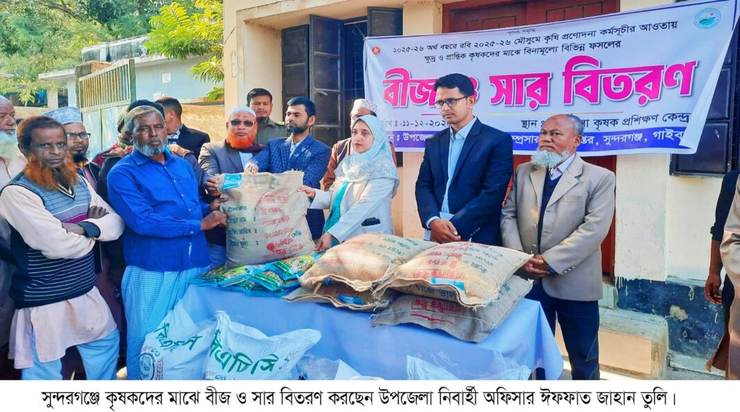গাইবান্ধার সুন্দরগঞ্জ উপজেলায় রবি মৌসুমে কৃষি প্রণোদনার কর্মসূচীর আওতায় ক্ষুদ্র ও প্রান্তিক কৃষকদের মাঝে বিনামূল্যে বীজ ও সার বিতরণ করা হয়েছে। বৃহস্পতিবার উপজেলা কৃষি অধিদপ্তরের আয়োজনে কৃষক প্রশিক্ষণ কেন্দ্র চত্বরে বীজ ও সার বিতরণ করেন উপজেলা নিবার্হী অফিসার ঈফফাত জাহান তুলি।