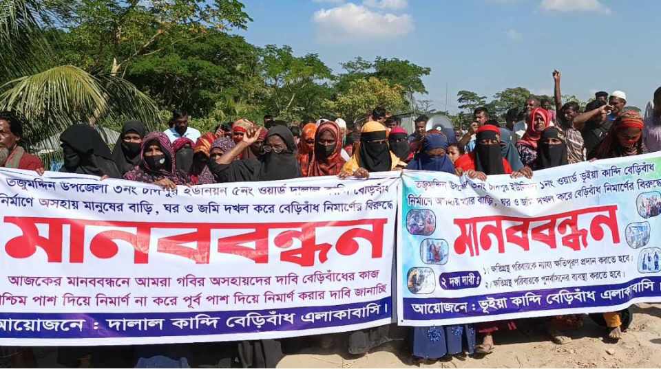 ভোলার তজুমদ্দিন উপজেলায় বেড়িবাঁধ নির্মাণ প্রকল্পে বসতবাড়ি উচ্ছেদ বন্ধ ও ক্ষতিগ্রস্তদের পুনর্বাসনের দাবিতে মানববন্ধন করেছে প্রায় দুই শতাধিক পরিবার।