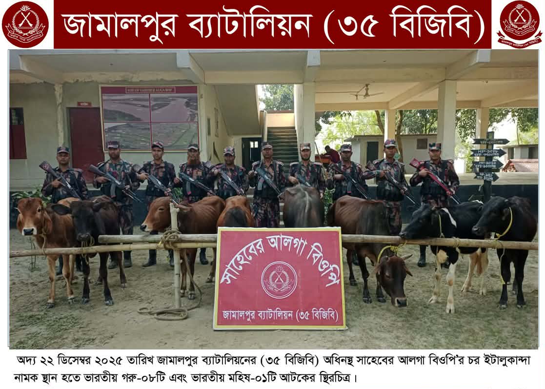 ২২ ডিসেম্বর সোমবার আনুমানিক সকাল ০৬:০০ ঘটিকায় নিজস্ব গোয়েন্দা তথ্যের ভিত্তিতে জামালপুর ব্যাটালিয়নের (৩৫ বিজিবি) অধিনস্থ সাহেবের আলগা বিওপি কর্তৃক চোরাচালান বিরোধী অভিযান পরিচালনাকালে সীমান্ত পিলার ১০৫১/১-এস হতে আনুমানিক ১০০ গজ বাংলাদেশের অভ্যন্তরে চর ইটালুকান্দা নামক স্থান হতে ভারতীয় গরু-০৮টি এবং ১ টি মহিষ আটক করতে সক্ষম হয়।
