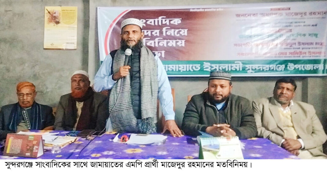 গাইবান্ধার-১ সুন্দরগঞ্জ আসনের বাংলাদেশ জামায়াতে ইসলামীর এমপি প্রার্থী মো. মাজেদুর রহমান উপজেলয় কর্মরত গণমাধ্যমকর্মীদের সাথে মতবিনিময় করেছেন। সোমবার রাত ৭টার দিকে জামায়াতের উপজেলা কার্যালয়ে মতবিনিময় সভা অনুষ্ঠিত হয়।