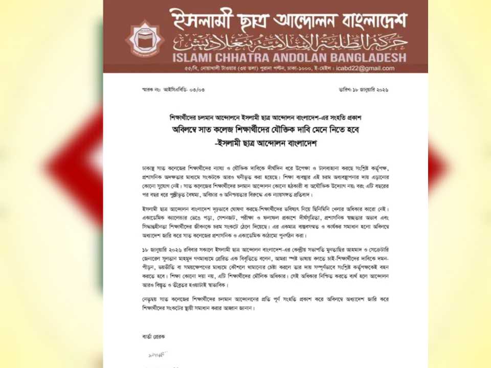 ইসলামী ছাত্র আন্দোলন বাংলাদেশ দৃঢ়ভাবে ঘোষণা করছে-শিক্ষার্থীদের ভবিষ্যৎ নিয়ে ছিনিমিনি খেলার অধিকার কারো নেই। একাডেমিক ক্যালেন্ডার ভেঙে পড়া, সেশনজট, পরীক্ষা ও ফলাফল প্রকাশে দীর্ঘসূত্রিতা, প্রশাসনিক স্বচ্ছতার অভাব এবং সিদ্ধান্তহীনতা শিক্ষার্থীদের জীবনকে চরম সংকটে ঠেলে দিয়েছে। এর একমাত্র বাস্তবসম্মত ও কার্যকর সমাধান হলো অবিলম্বে অধ্যাদেশ জারি করে সাত কলেজের প্রশাসনিক ও একাডেমিক কাঠামো পুনর্গঠন করা।