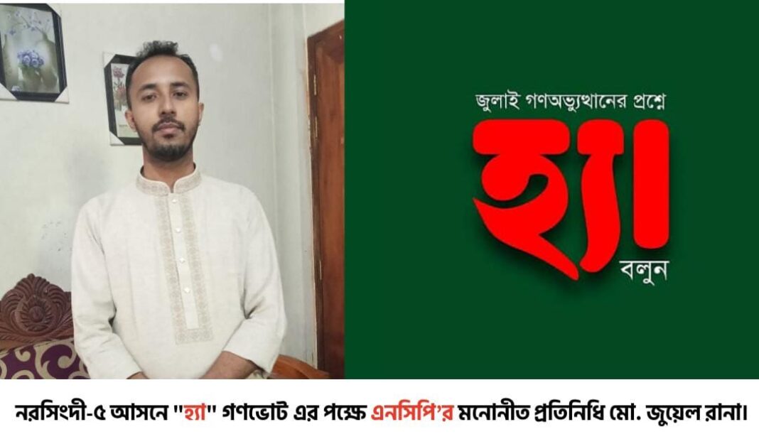নরসিংদী-৫ (রায়পুরা) আসনে আসন্ন গণভোটে ‘হ্যাঁ’ ভোটকে জয়যুক্ত করার লক্ষ্যে এনসিপি’র ব্র্যান্ড এম্বাসেডর/প্রতিনিধি হিসেবে নিযুক্ত হয়েছেন মো. জুয়েল রানা। স্থানীয় পর্যায়ে গণভোট সংশ্লিষ্ট প্রচারণাকে আরও সংগঠিত, গতিশীল ও কার্যকর করতেই এ সিদ্ধান্ত নেওয়া হয়েছে।