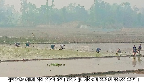 ঘন কুয়াশা ও কন কনে ঠান্ডা কমে যাওয়ায় গাইবান্ধার সুন্দরগঞ্জ উপজেলায় বোর চারা রোপন শুরু হয়েছে। নির্বাচনের কারণে দেখা দিয়ে দিনমজুর সংকট। বিশেষ করে নিচু এলাকায় চলতি বোর মৌসুমে চারা রোপনের কাজ শুরু হয়েছে। কিন্তু দিনমজুর না পাওয়ায় হতাশাগ্রস্থ হয়ে পড়েছে কৃষকরা। নিম্নবিত্ত শ্রেণির কৃষকরা পরিবার পরিজন নিয়ে চাষাবাদের কাজ করলেও উচ্চ ও মধ্যবিত্ত শ্রেণির কৃষকরা দিনমজুর ছাড়া কাজ করতে পারছে না।