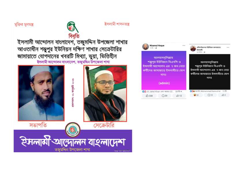 ইসলামী আন্দোলন বাংলাদেশ তজুমদ্দিন উপজেলা শাখার আওতাধীন শম্ভুপুর ইউনিয়ন দক্ষিণ শাখার বর্তমান সেক্রেটারি মুহাম্মদ জিসান বলেন,” আমি বর্তমানে এই ইউনিয়ন এর সেক্রেটারি। তারা যে নামে ইউনিয়ন সেক্রেটারি জামায়াতে যোগদান করেছে হিসেবে ঘোষণা করেছে। তা গুজব, ভুয়া ও ভিত্তিহীন। আমি এই গুজবের তীব্র নিন্দা ও প্রতিবাদ জানাই।”