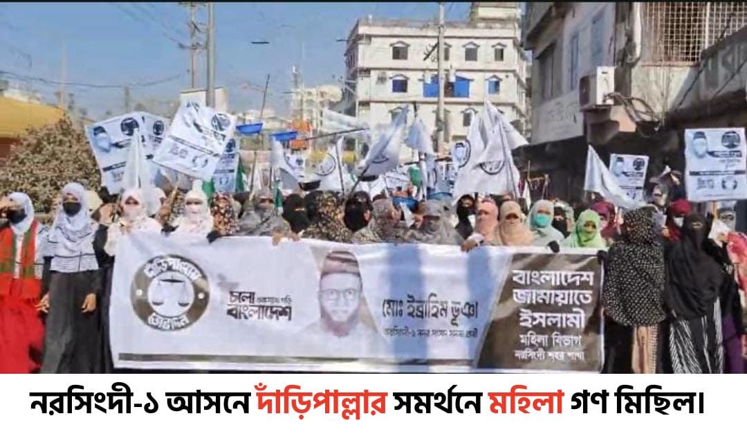 নরসিংদী-১ (সদর–মাধবদী) আসনে জোটের প্রার্থী ও জামায়াতের পেশাজীবী সংগঠনের নেতার পক্ষে দাঁড়িপাল্লা প্রতীকের নারী গণমিছিল অনুষ্ঠিত হয়েছে।