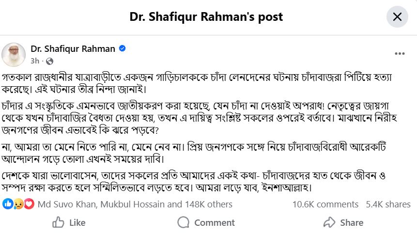 শফিকুর রহমান লিখেন, মাঝখানে নিরীহ জনগণের জীবন এভাবেই কি ঝরে পড়বে? না, আমরা তা মেনে নিতে পারি না, মেনে নেব না। প্রিয় জনগণকে সঙ্গে নিয়ে চাঁদাবাজবিরোধী আরেকটি আন্দোলন গড়ে তোলা এখনই সময়ের দাবি।