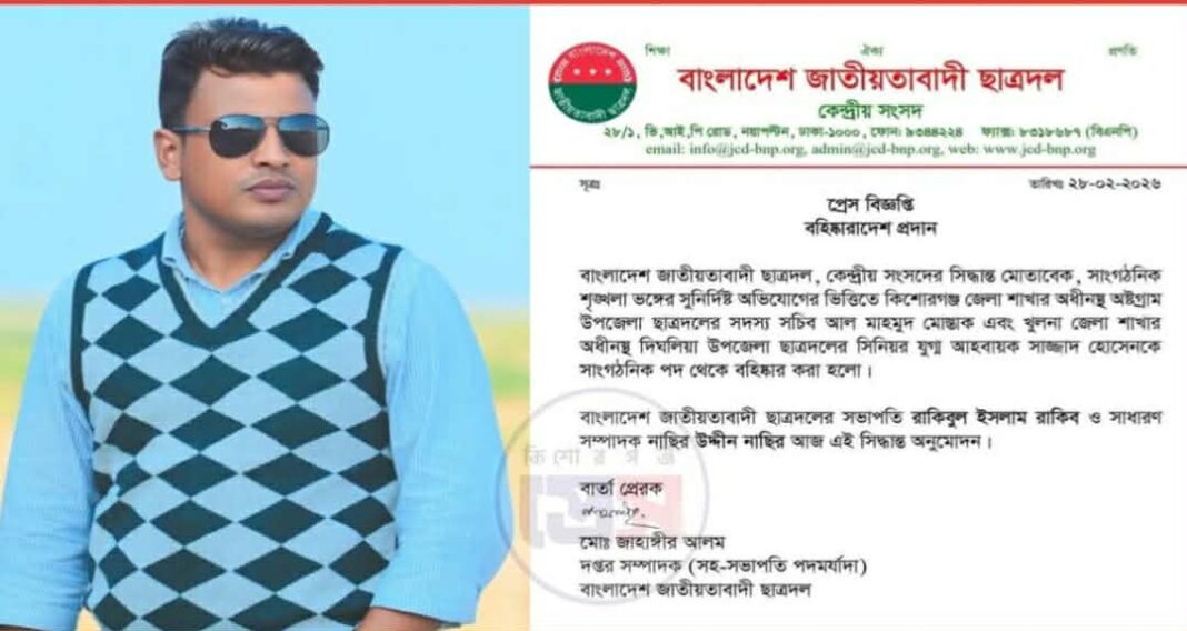 অষ্টগ্রাম উপজেলার পূর্ব অষ্টগ্রাম এলাকার নির্মাণাধীন বাধাঘাট ব্রীজ দিয়ে জোরপূর্বক গাড়ি দিয়ে চলাচল করতে ব্রীজের ঠিকাদারের ম্যানেজারকে অকথ্য ভাষায় গালিগালাজ ও এলাকা থেকে তুলে নিয়ে যাওয়ার হুমকিদাতা উপজেলা ছাত্রদলের সদস্য সচিব আল মাহমুদ মোস্তাককে আজ ২৮ শেষ ফেব্রুয়ারি দল থেকে বহিষ্কার করেছে ।