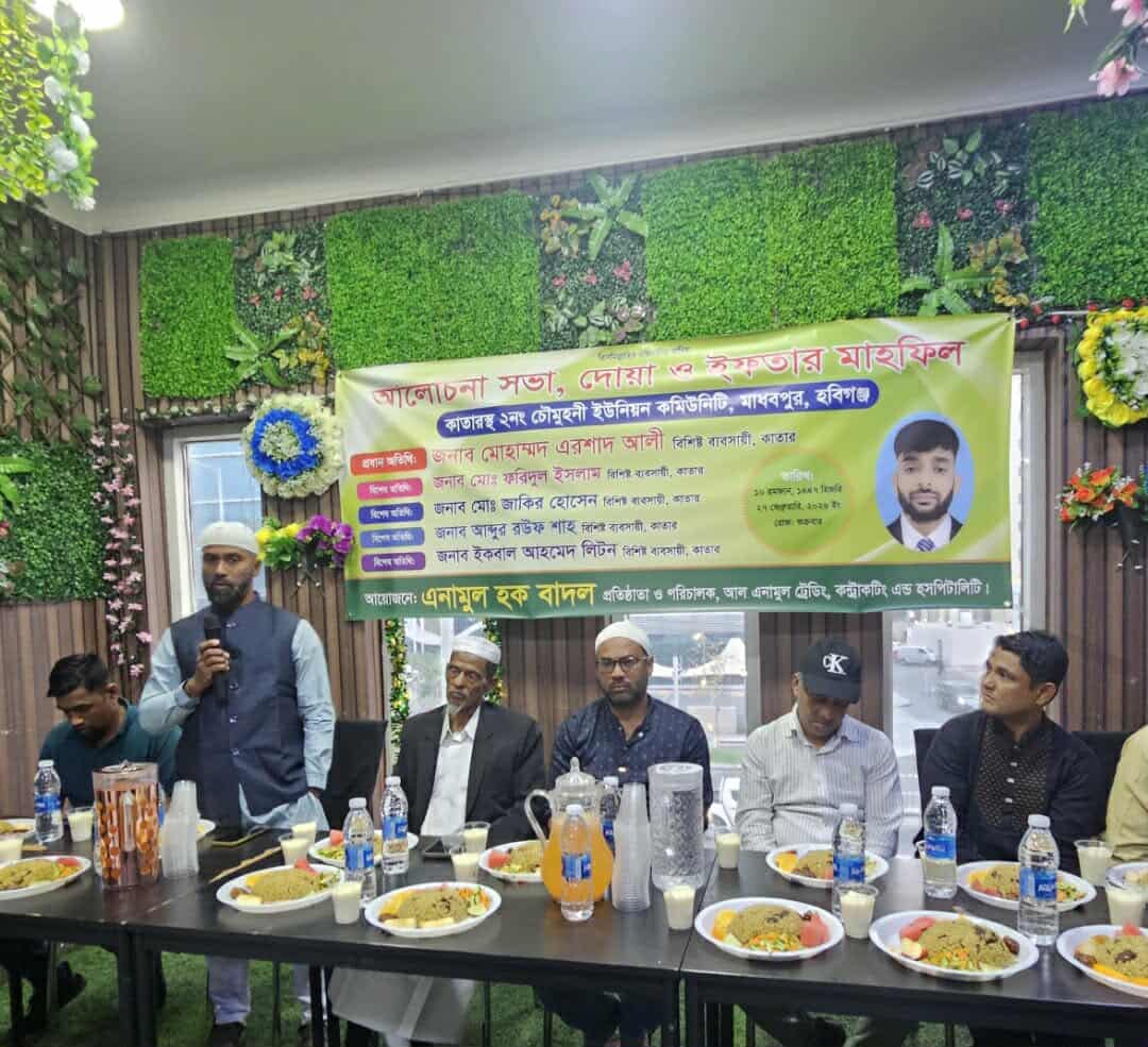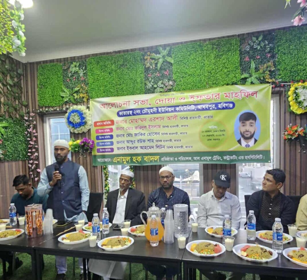 কাতারে বসবাসরত হবিগঞ্জের মাধবপুর উপজেলার চৌমুহনী ইউনিয়নের প্রবাসীদের সম্মানার্থে এনামুল ট্রেডিং, কন্ট্রাকটিং অ্যান্ড হসপিটালিটি–এর প্রতিষ্ঠাতা ও পরিচালক এনামুল হক বাদলের উদ্যোগে আলোচনা, দোয়া ও ইফতার মাহফিল অনুষ্ঠিত হয়েছে।
