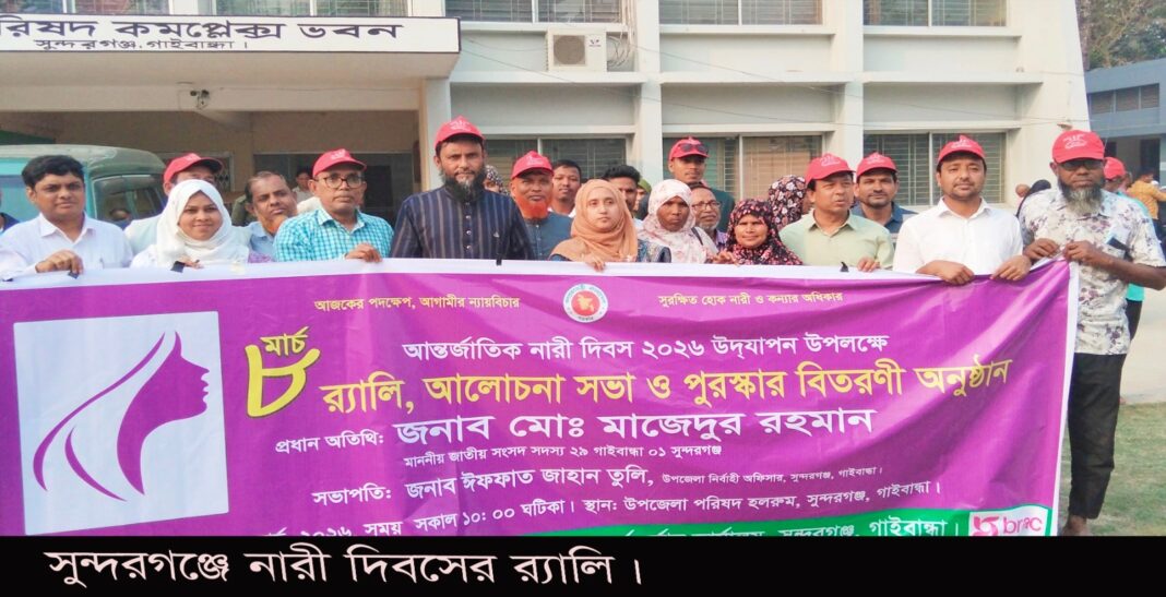 “আজকের পদক্ষেপ, আগামীর ন্যায় বিচার সুরক্ষিত হোক নারী ও কন্যার অধিকার” এই প্রতিপাদ্যকে সামনে রেখে গাইবান্ধার সুন্দরগঞ্জ উপজেলায় আন্তর্জাতিক নারী দিবসের র্যালি, আলোচনা এবং পুরস্কার বিতরণ অনুষ্ঠিত হয়েছে।