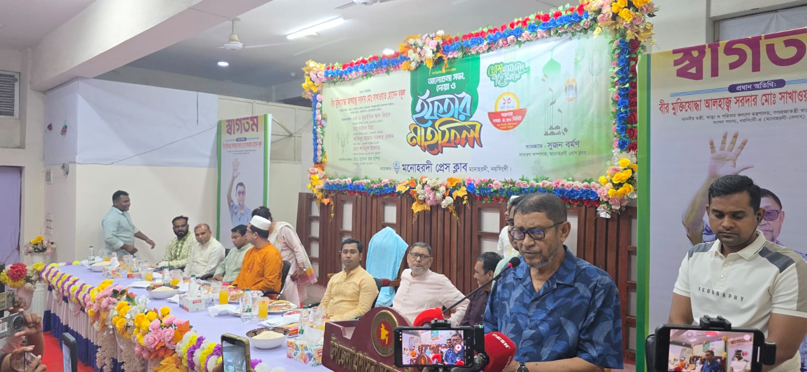 মনোহরদী প্রেস ক্লাবের সভাপতি হারুন অর রশিদ এর সভাপতিত্বে অনুষ্ঠানে শুভেচ্ছা বক্তব্য রাখেন, নরসিংদী জেলা বিএনপির সহ-সভাপতি সরদার তোফাজ্জল হোসেন লিয়াকত, মনোহরদী উপজেলা নির্বাহী কর্মকর্তা এম এ মুহাইমিন আল জিহান, সহকারী কমিশনার (ভূমি) মোঃ সজিব মিয়া, মনোহরদী থানা অফিসার ইনচার্জ মোঃ শাহিনুল ইসলাম, মনোহরদী উপজেলা বিএনপির সদস্য সচিব আমিনুর রহমান সরকার দোলন ও মনোহরদী প্রেস ক্লাবের সাধারণ সম্পাদক সুজন বর্মণ।